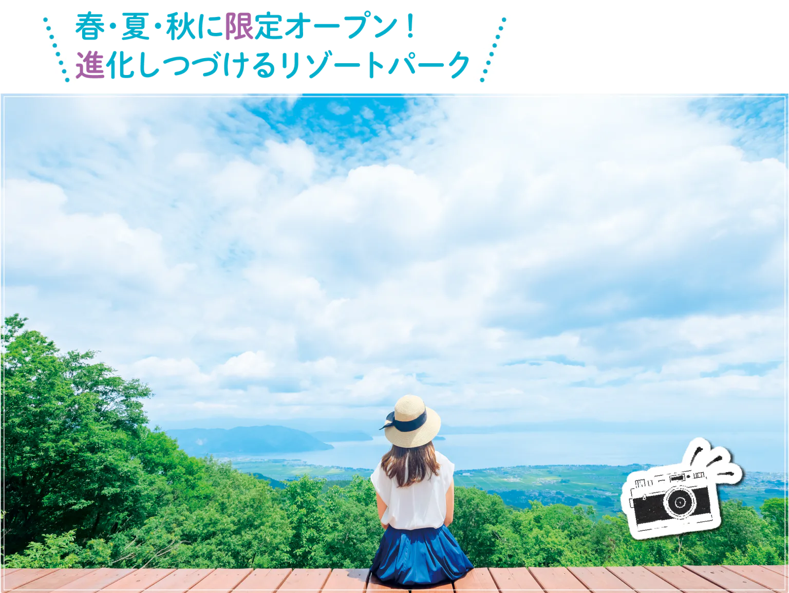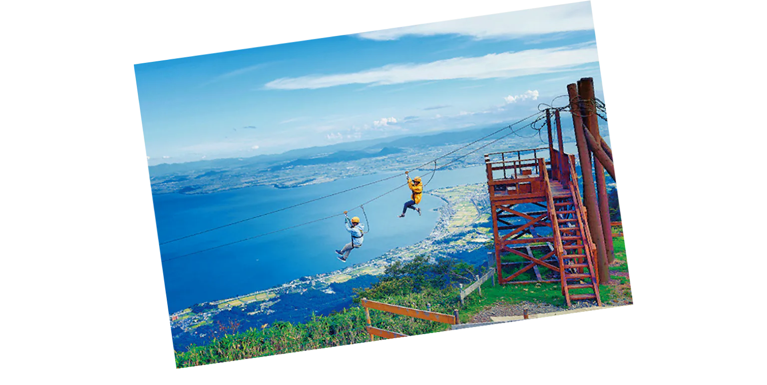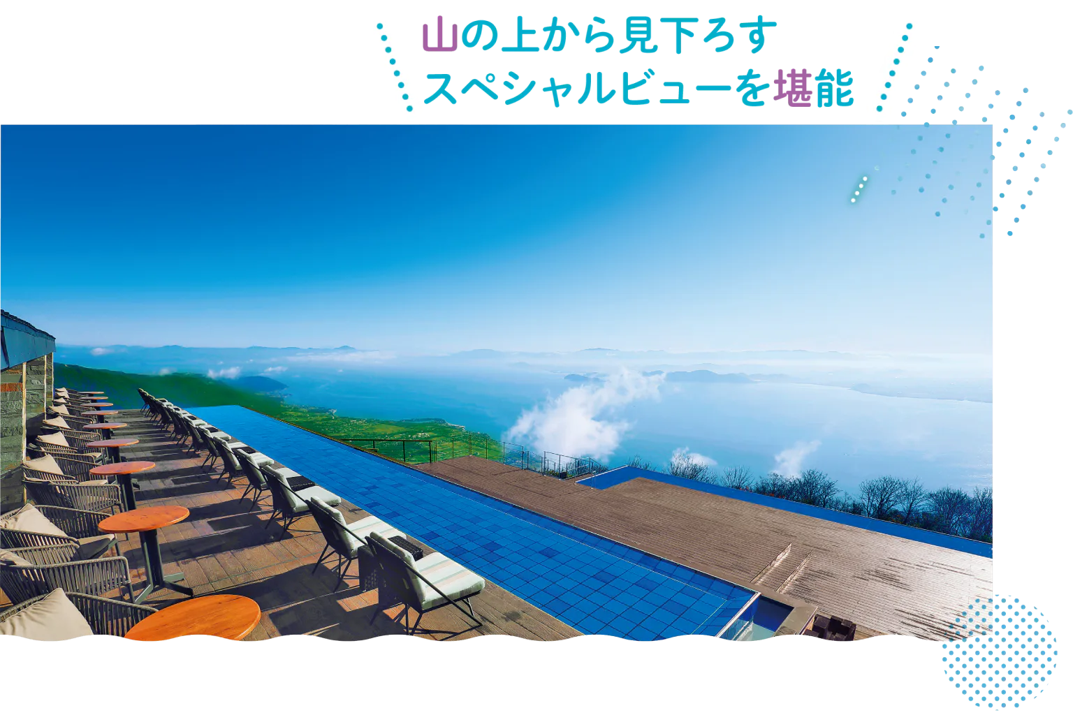 標高約1108mの打見山と標高1174mの蓬莱山、2つの山の間に広がる高原リゾート施設。ウッドデッキと水盤が印象的なグランドテラスと湖北を一望するノーステラス、Café 360の3つからなる「びわ湖テラス」の眺めは圧巻。ノーステラスには有料シート「インフィニティラウンジ」もある。