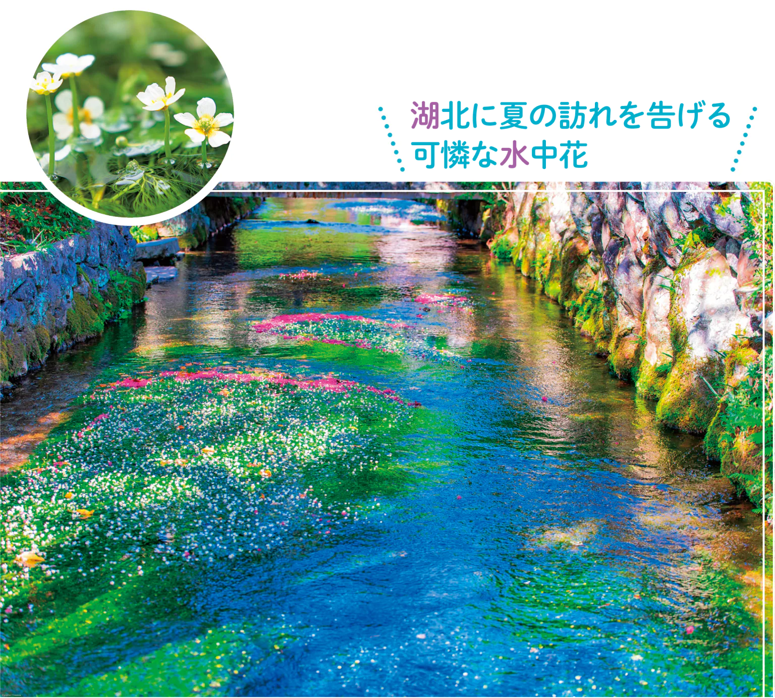 水温14℃前後の清流でしか生育しないといわれる水中花・梅花藻(ばいかも)。梅の花に似た純白の花が水面を染め、醒井を 訪れる人々を魅了する。地蔵川にはトゲウオ科の「ハリヨ」という名の希少な淡水魚が生息している。