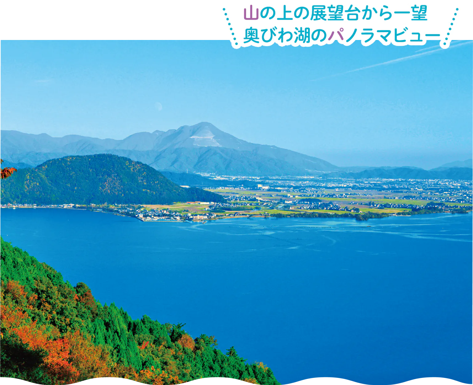 びわ湖を山の上から見下ろすと、空と湖が溶け合ったような青のグラデーションの景色が広がる。滋賀旅の醍醐味ともいえる”びわ湖ブルー”。山と湖が織りなす青の共演を楽しもう!