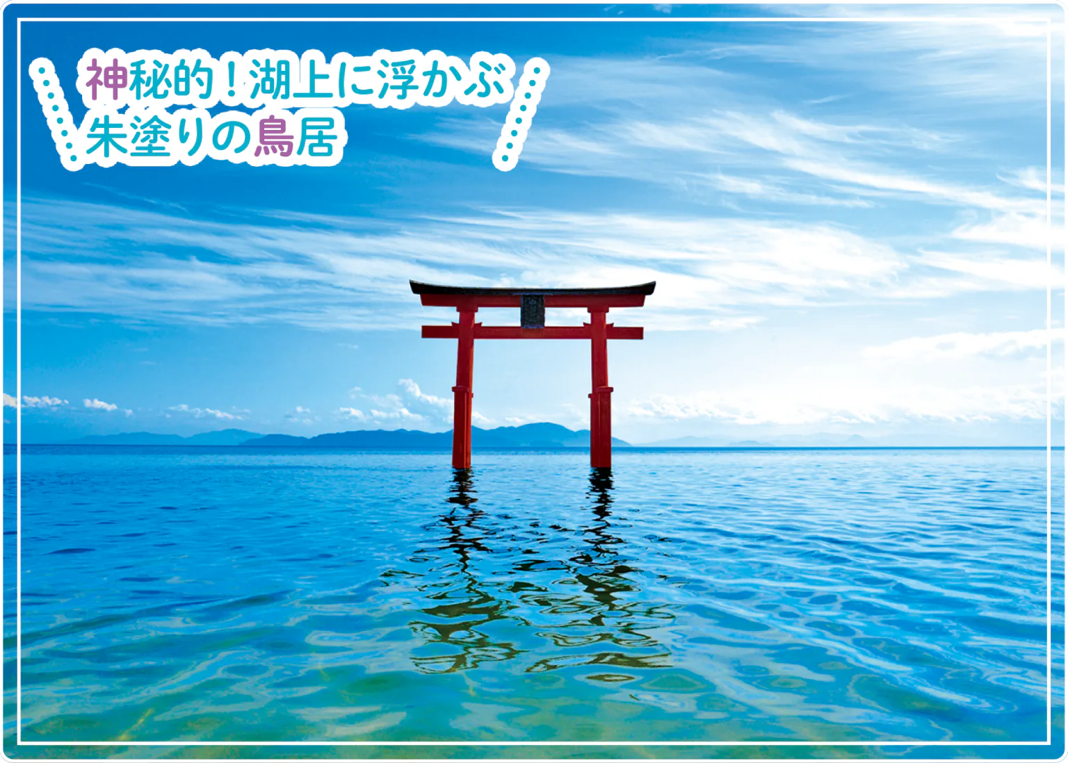 近江最古級の神社で、能を大成した観阿弥の謡曲「白鬚」にも綴られる。導きや道開きの神・猿田彦命(さるたひこのみこと)を祀り、長寿、縁結び、子授けなどあらゆるご利益があるという。青空もいいが、鳥居と日の出の競演もすばらしい。