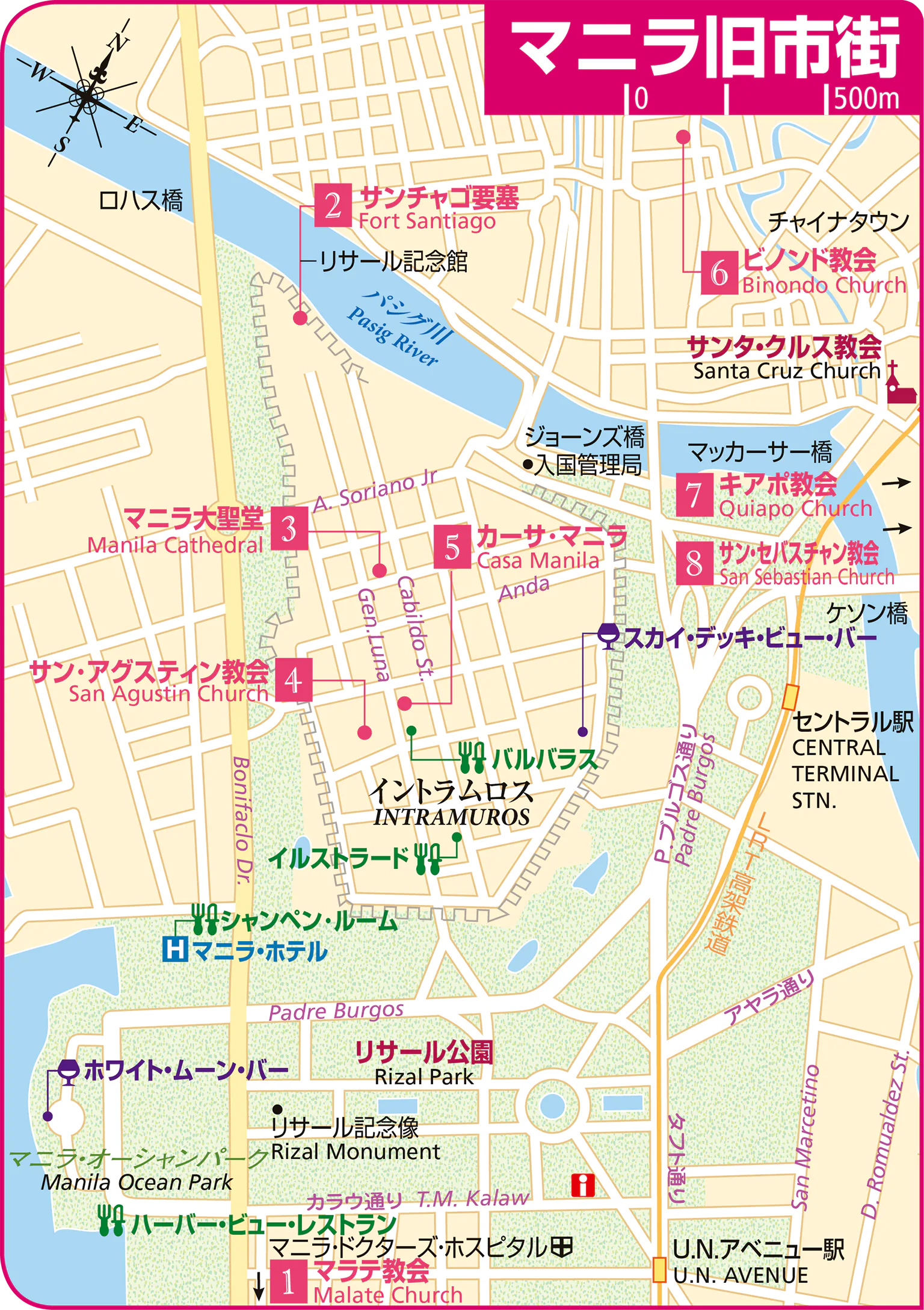 紹介した8カ所を巡ると移動時間も含めて4時間ほどかかる。時間がないときは、イントラムロス内にあるサンチャゴ要塞からカーサ・マニラまでの4カ所を徒歩で回るのもあり。これなら所要2時間弱で、世界遺産のサン・アグスティン教会も見られる