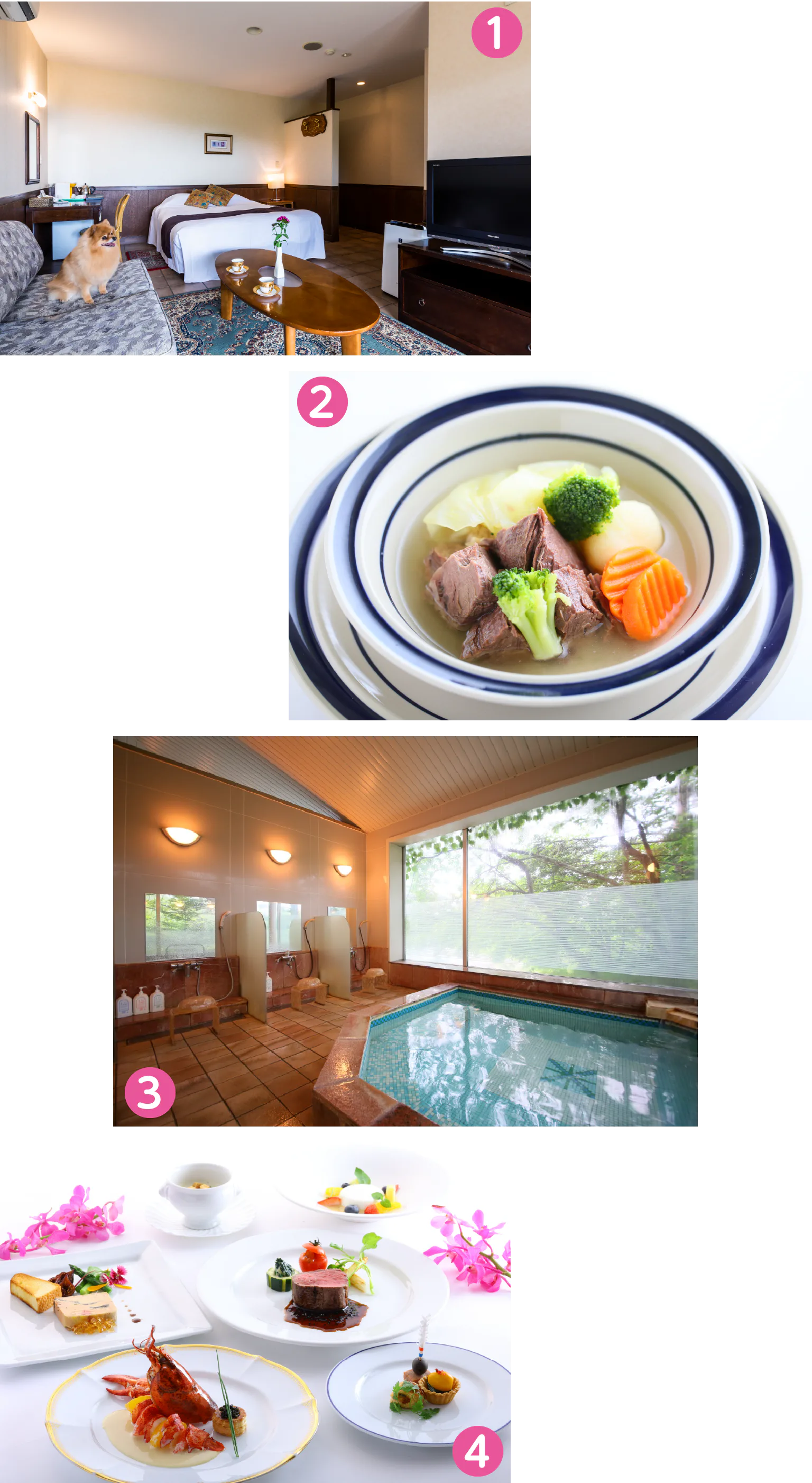 ①アネックス・コンフォート・ダブル/②ペット用メニュー「牛肉のポトフ」/③大浴場/④メインダイニングのコース料理の一例