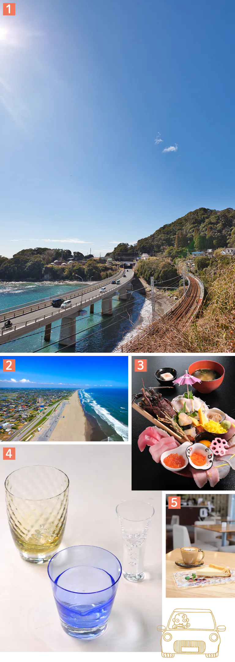 1.鴨川の江見付近を爽快にドライブ 2.九十九里では、どこまでも続く砂浜を眺めながら有料道路を北上する 3.ランチには伊勢海老のほか季節の地魚をたっぷりと使った豪快な海鮮丼を 4.「Sghr スガハラ ファクトリーショップ」でお気に入りのグラスを見つけよう 5.「Sghr café」では、ガラスの器の楽しみ方を提案