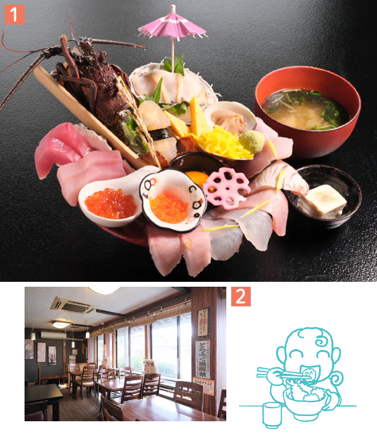 1.伊勢海老やアワビ、ハマグリ、地魚が豪快にのった「極上いすみまるごと海鮮丼」(地魚あら汁付)4070円 2.店内にはテーブル席や座敷席、カウンター席などがある