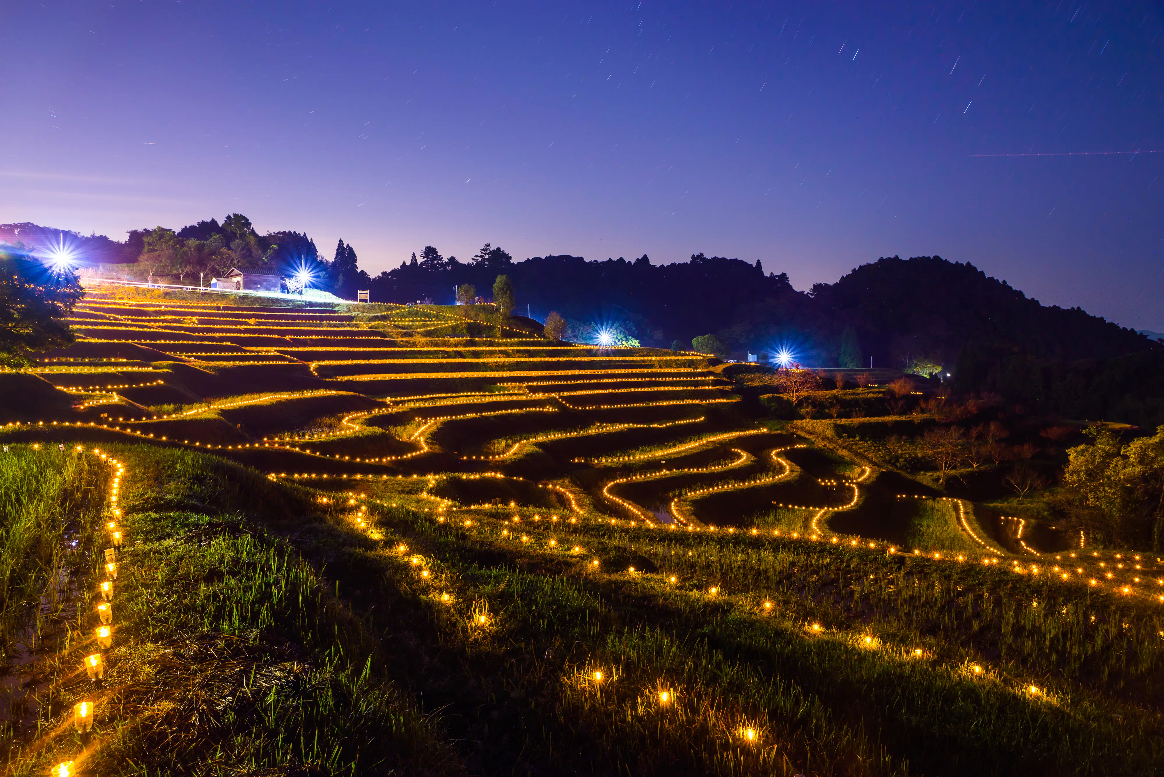 秋から冬にかけて、大山千枚田ではライトアップイベント「棚田のあかり」が開催される。さまざまに色を変えるLEDライトによって田んぼ1枚1枚が縁取られ、光の波のような幻想的な光景に。昼間とはまったく違った風景は一見の価値アリ。