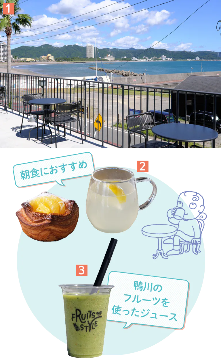 1.ブルワリーの2階には開放感抜群のテラス席がある 2.「鴨川産はっさくデニッシュ」385円(店内)、「ホットレモネード」510円(店内) 3.スムージー専門店「FRUITS STYLE」の9種の野菜が入った「グリーンフルーツスタイル」780円(テイクアウト)