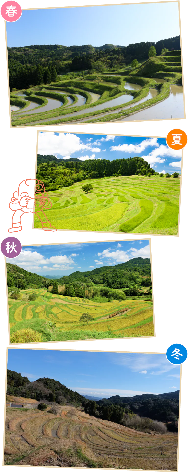 春.4月に代かきが始まりゴールデンウイークごろに田植えを終える 夏.稲がすくすくと育ち、鮮やかな緑の田んぼに 秋.8月末から9月上旬ごろの稲刈り直前には、黄金色の稲穂が見られる 冬.稲刈りが終わった後の田んぼはどこか寂しい。まれに積雪が見られることも