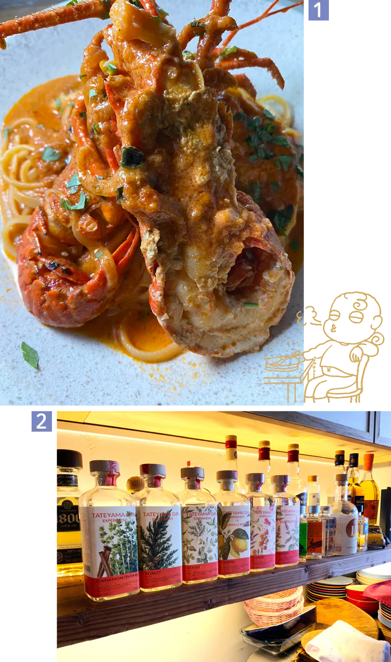 1.伊勢エビのトマトクリームパスタ。料理は季節や仕入れ状況により変わる 2.お酒も充実。「TATEYAMA GIN」のオリジナルレシピも豊富に揃う