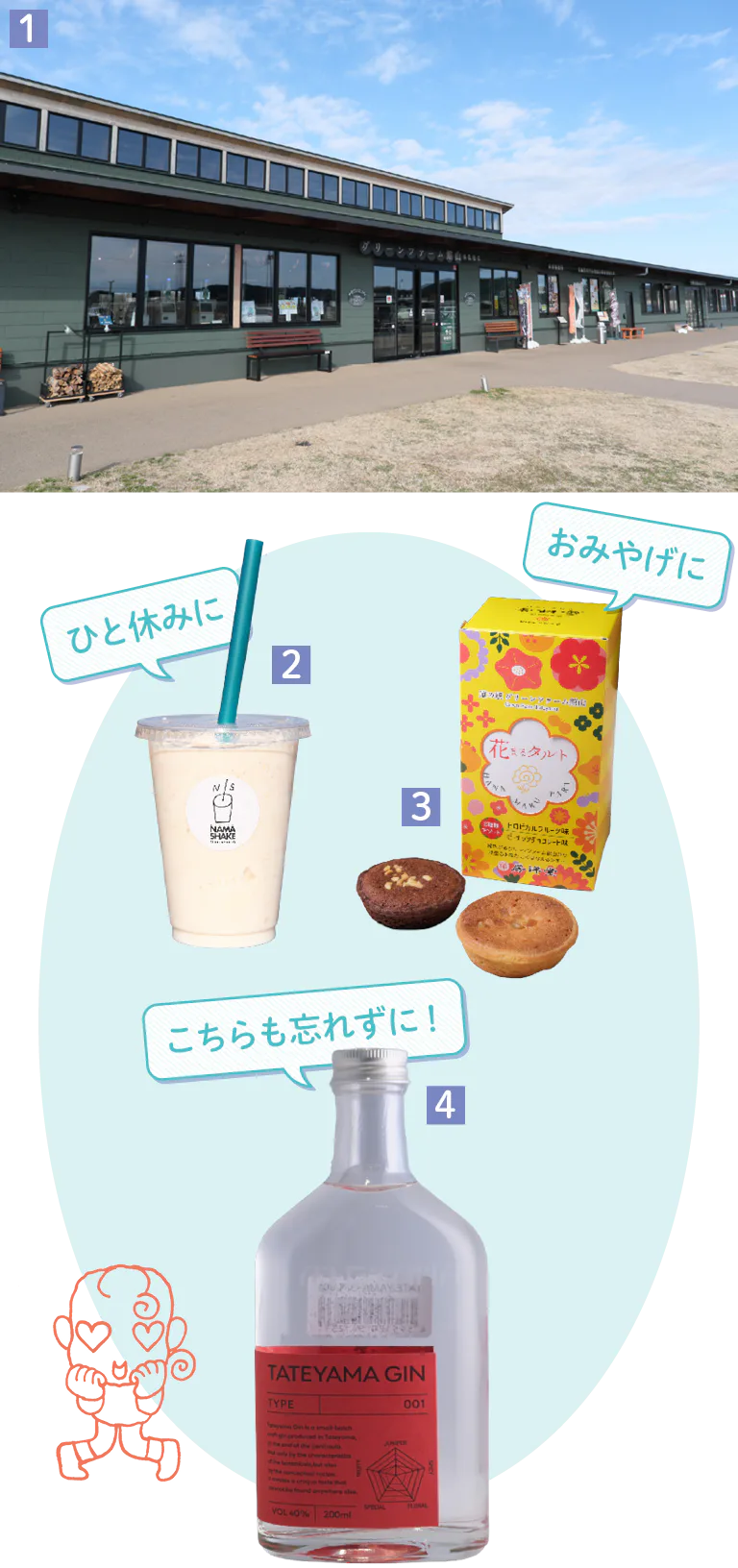 1.田園風景に溶け込む緑の建物 2.須藤牧場の「ピーナッツ生シェイク」900円 3.館山銘菓「花菜っ娘」の房洋堂が手がける道の駅オリジナル土産、「花まるタルト」5枚入り1188円 4.「TATEYAMA GIN 001」 200㎖2200円