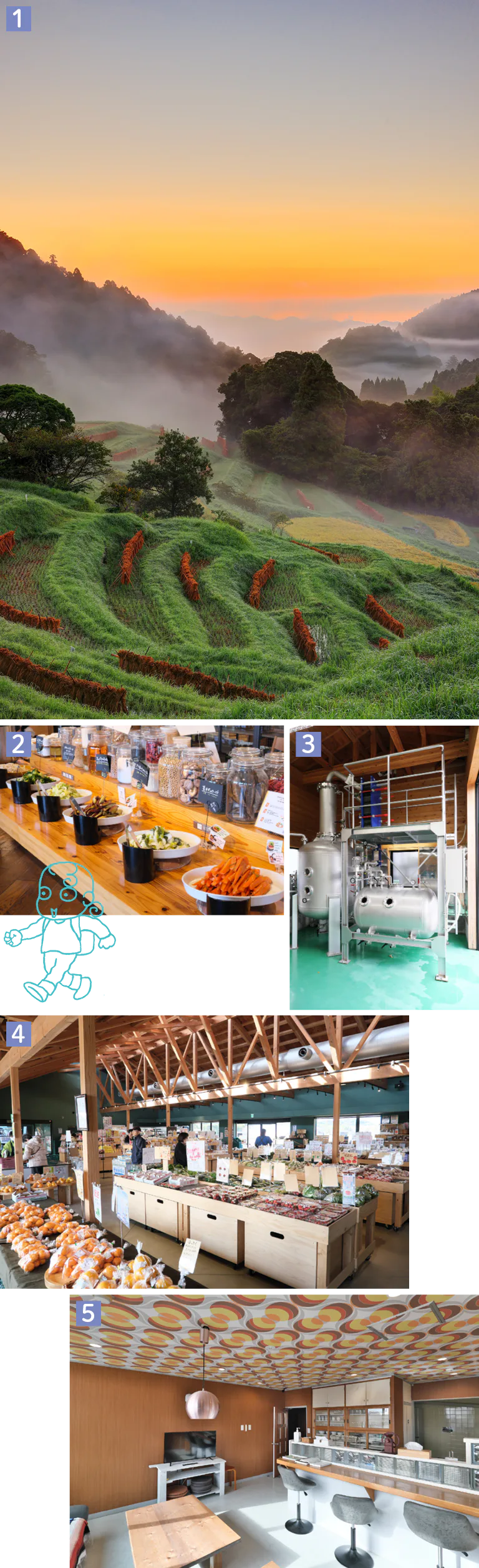 1.霧がかかる刈入れの終わった「大山千枚田」。春か秋の早朝に霧が発生する確率が高い 2.「Café & Meal MUJI みんなみの里」の「里山のサラダバー」 3.「亀田酒造」の減圧蒸留器 4.「道の駅 グリーンファーム館山」には地元産品が集結 5.「tu.ne.Hostel」の共用ラウンジは、宿泊者のコミュニケ-ションの場