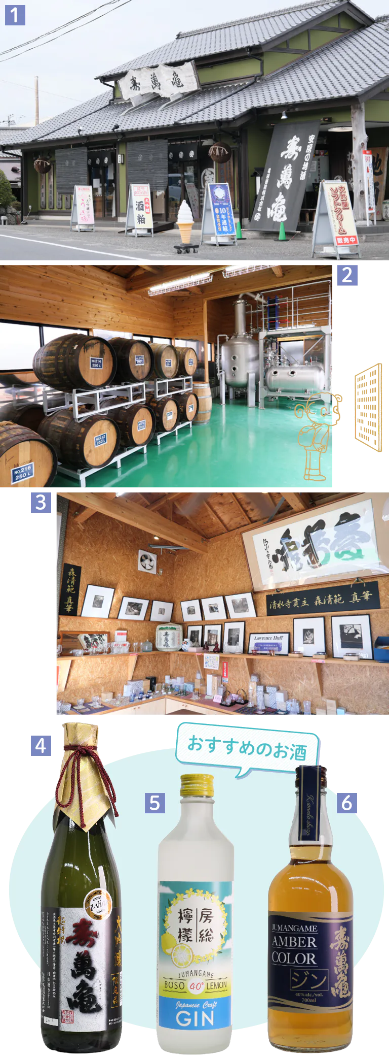1.長狭街道沿いにある老舗酒蔵 2.ジンを熟成させるシェリー樽と減圧蒸留器 3.敷地内にある寿萬亀ギャラリー(3号売店)では写真家ローレンス・ハッフ氏の作品を20枚以上展示 4.兵庫産山田錦を35%まで精米した、「超特撰大吟醸 寿萬亀」720㎖5590円 5.「房総檸檬」500㎖3300円。「寿萬亀」を蒸溜し、地元産レモンなどを香り付けに使用 6.「寿萬亀 アンバーカラー ジン」700㎖5500円。5種類の南房総産ボタニカルで香り付けしたジンをシェリー樽で貯蔵して深みのある味わいに