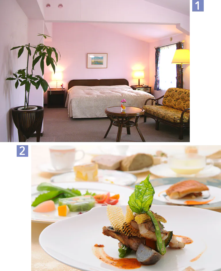 1.スタンダードダブルルーム 2.武田シェフが腕によりをかけて作るディナーコースの一例