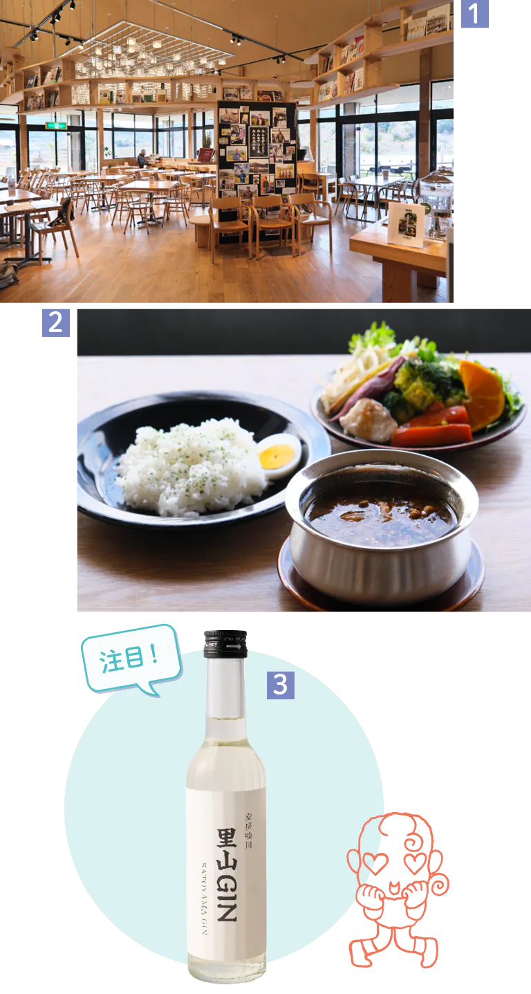 1.直売所に隣接するカフェ。大きくとられた窓の向こうに田園風景が広がる 2.プリンセスサリーをたのしむスープカレー1800円。スープバー、サラダバー付 3.地元の「長狭米」から造る日本酒を蒸留した里山GIN300㎖2860円
