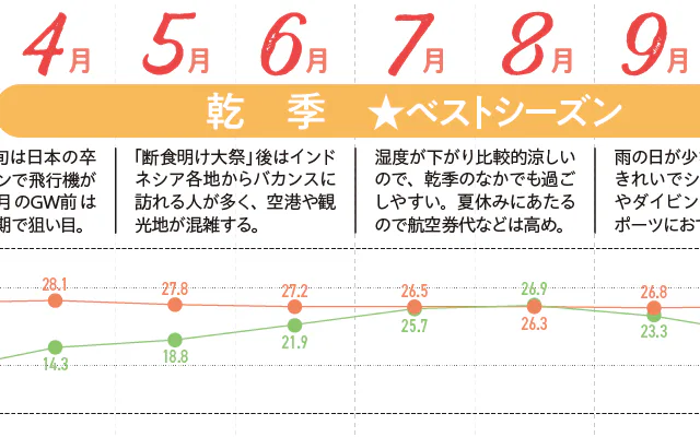 バリ島には雨季と乾季の2つのシーズンがあり気候が異なる。また、バリ州独自の祝日は店が休みになることが多いので事前に確認しておこう。