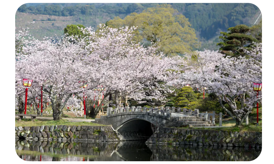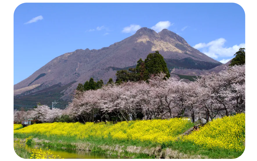 大分の春は、温泉街に近い山と水辺に映える桜が見どころ。由布院温泉では大分川沿いに桜が咲き誇り、別府では街の公園など身近な場所で花見が楽しめ、山に囲まれた不動尊一心寺では九州最大級の八重桜の名所も。見ごろは3月下旬~4月上旬。歴史と広大な自然を感じる花見ができるのは大分ならでは。
