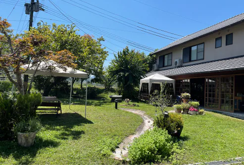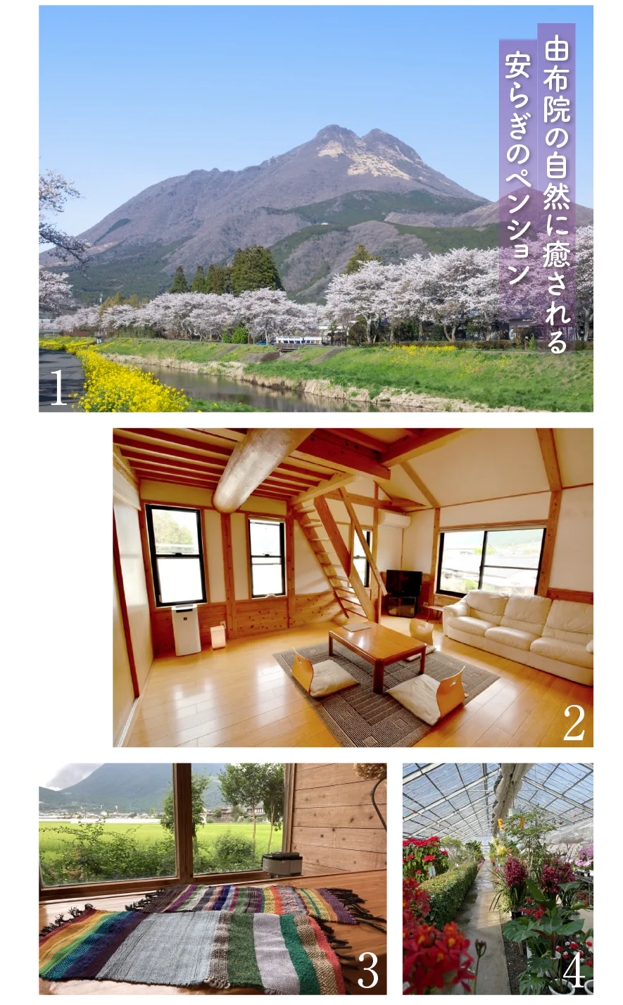 由布岳を望む自然豊かなロケーションに佇むペンション。大分川沿いの桜並木から500mほどの場所にあり、春には宿周辺にも桜が咲き、穏やかな風景が広がる。温泉棟には内風呂が2つあり、終日時間制での貸し切り利用が可能。素泊まりが基本だが、オプションでパンとスープの軽い朝食を提供しているほか、バーベキュープラン(材料持ち込み)なども利用できる。敷地内には温泉熱を使ったガラス温室があり、ハーブや熱帯植物が一年中見られるほか、はた織りや押し花といった体験も人気。隣にはいちご狩りが楽しめる「由布院いちご園」もある。