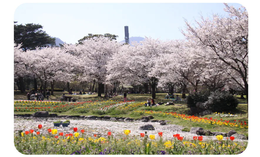 JR別府駅からも徒歩でアクセス可能な別府公園。四季ごとの美しさを堪能でき、春は約100本のソメイヨシノやミツバツツジ、藤にチューリップとさまざまな花が咲き誇り、多くのお花見客で賑わう。温泉地・別府らしい開放的な空気の中、レジャーシートを敷いてピクニックを楽しんだり、整備された公園を散策したり。桜の見頃は3月下旬~4月上旬。春の息吹を体いっぱいに感じたい。