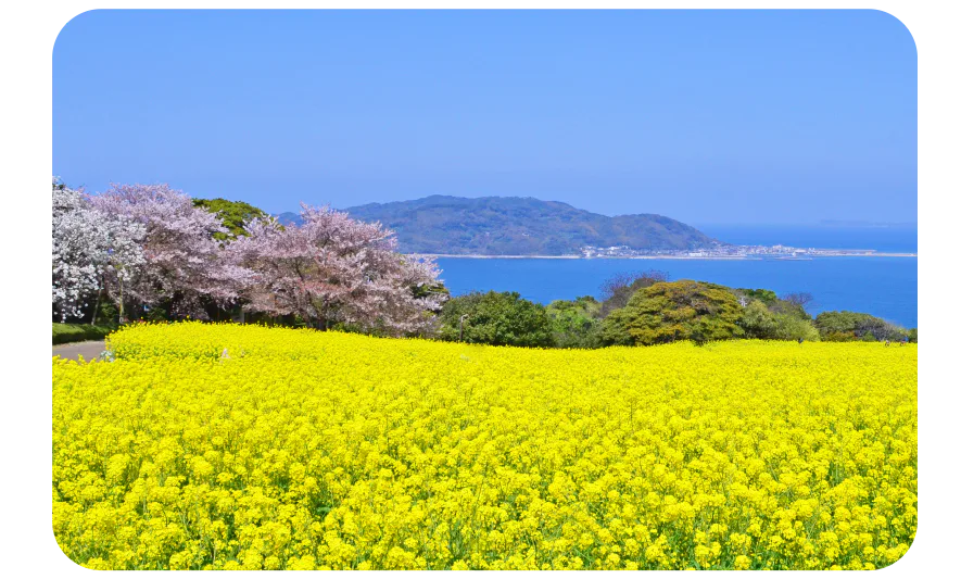 桜と菜の花と海のブルーの美しい共演に思わず見入ってしまう