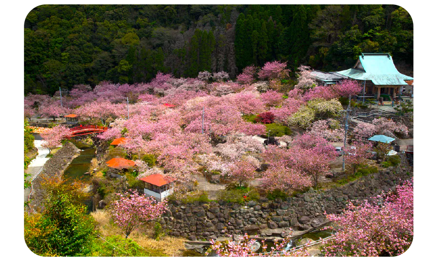 昭和38年に安部一僧正によって建立された一心寺。山に囲まれた2万坪の境内には、日本一大きな不動明王像や全長17メートルの薬師寺観音、湧水を引いて造られた滝などがある。中でも、初代住職が病弱な妻の快気を願い植樹した約700本のぼたん桜(八重桜)は「桜の雲海」と呼ばれ、今では九州最大の八重桜の名所となっている。毎年4月に行われる「一心寺ぼたん桜雲海祭り」、2026年は4月3日~19日で開催予定(本年は夜間営業なし)。
