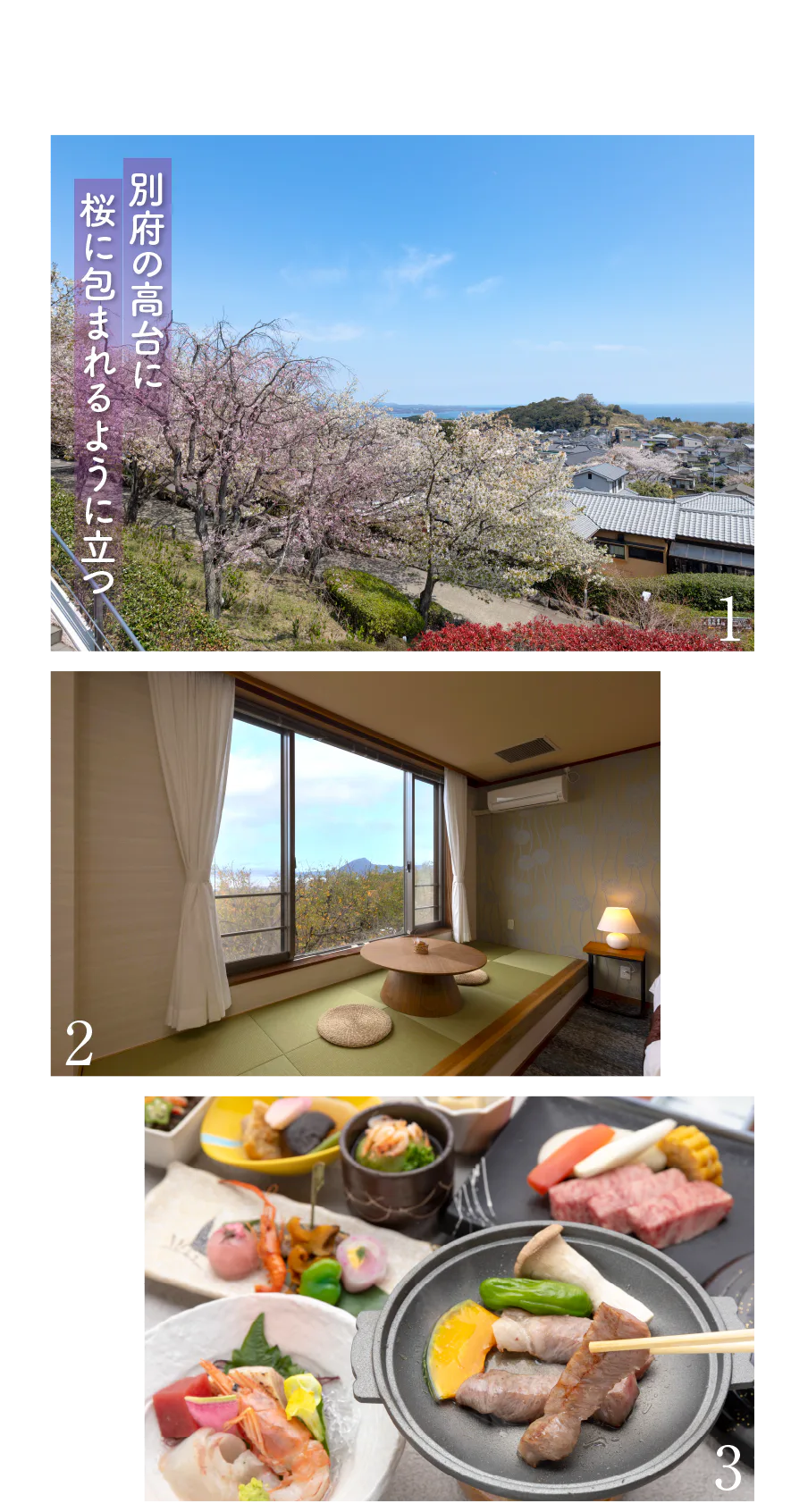 1.別府の海と街並みを一望、春には満開の桜が彩りを添える 2.落ち着いた雰囲気の客室。窓から桜が見える部屋もある 3.夕食では地元の旬の食材を使った料理が味わえる