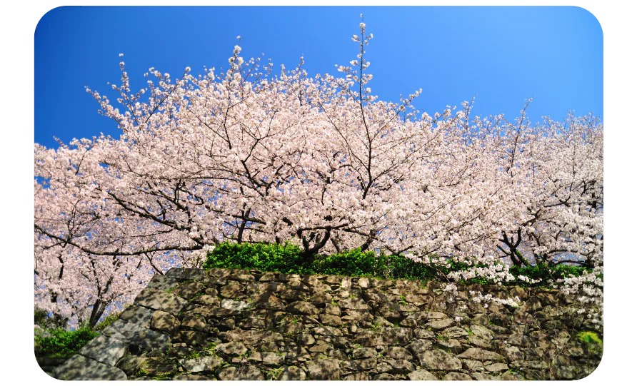 佐賀の桜は、城下町や温泉街の情緒とともに楽しめるのが魅力。佐賀市では佐賀城公園の堀沿いや金立公園、武雄温泉では広大な庭園に桜が咲き誇り、小城公園では名木が春を彩る。見ごろは3月下旬~4月上旬。広々とした公園内を散策しながら、のんびりと桜を眺めたい。