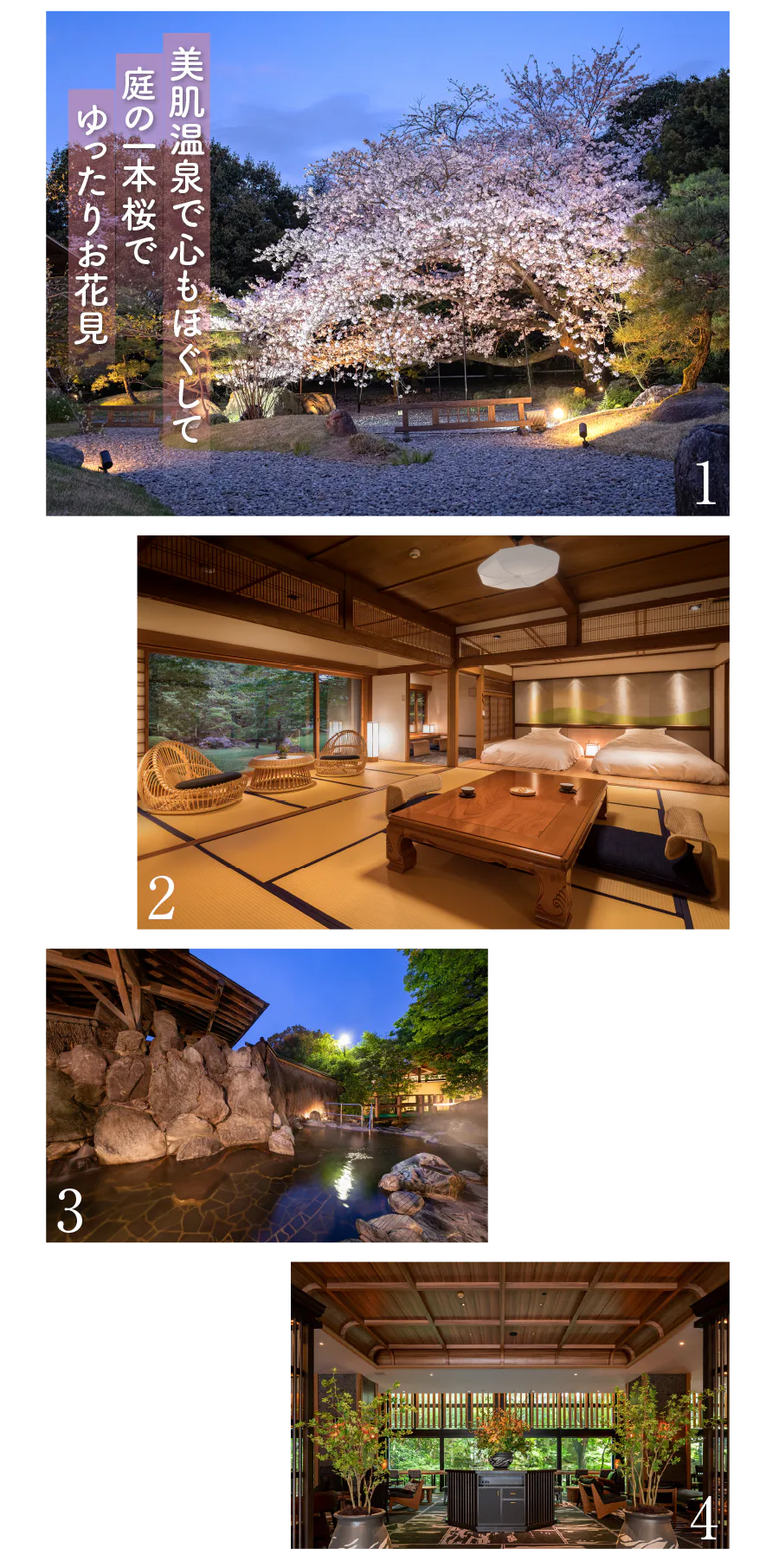 1.ライトアップされて浮かび上がる、庭園に咲く幽玄な一本桜「あさくら扇桜」 2.桜が望める離れの客室「待月庵」。源泉かけ流しの温泉付き 3.自然豊かな景色を楽しめる露天風呂で春風を感じる 4.庭を眺めながらゆっくりできるロビーラウンジ