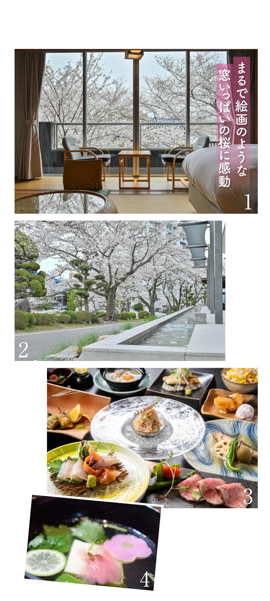 1.客室から満開の桜が眺められるスーペリア和洋室 2.花見をしながら楽しめる足湯 3.「地産地消」をベースにした料理。名物の「嬉野湯どうふ」、佐賀県産和牛も味わえる 4.春は桜の花びらをあしらうなど、季節感が感じられる料理