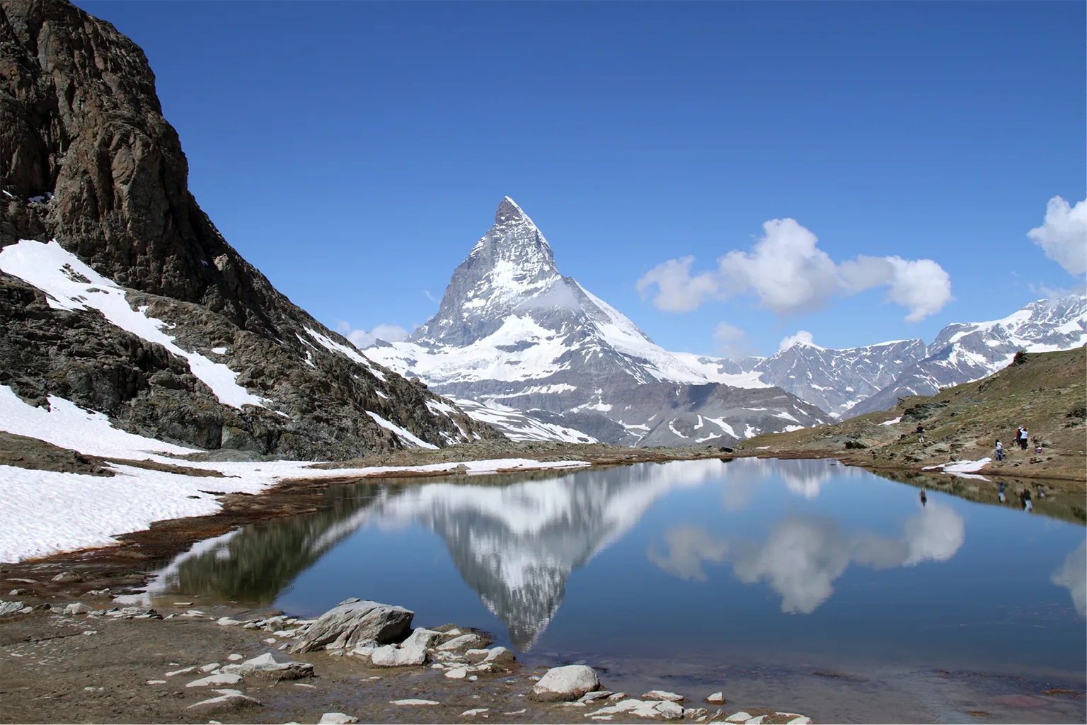 途中駅のローテンボーデンからリッフェルベルクまでをハイキングで下る。道中の路面は整備されている。山上湖のリッフェルゼーでは、水面に逆さマッターホルンが見られることも。