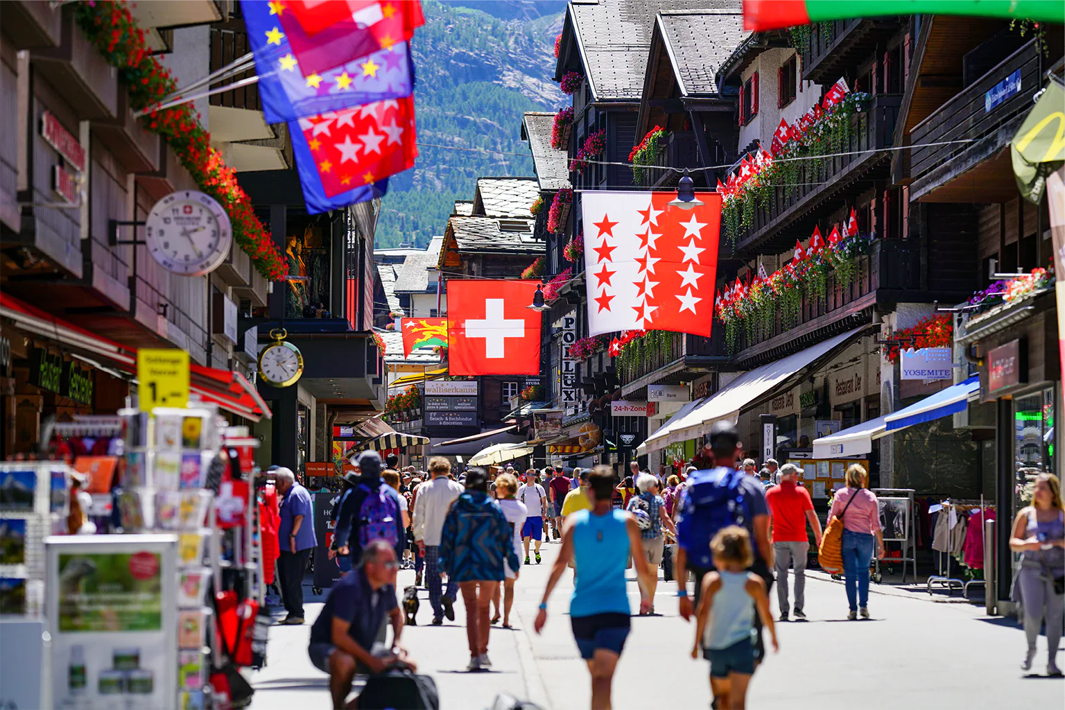 ツェルマットの駅から南北に延びるバーンホフ通り。観光客たちで賑わう