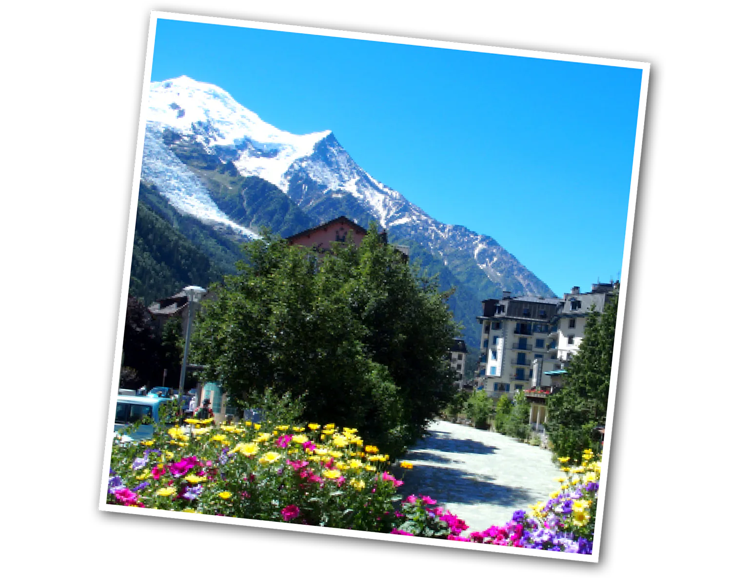 モンブランからの氷河の雪解け水が流れるアルヴ川。街のあちこちには花が飾られ、景色に彩りを添える