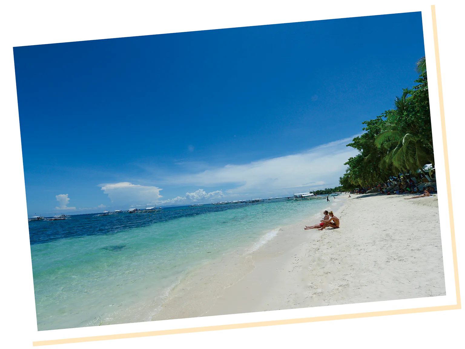 パングラオ島の南西部に延びる白砂ビーチ。周辺にはリゾートホテルやレストランが集まり賑やか。