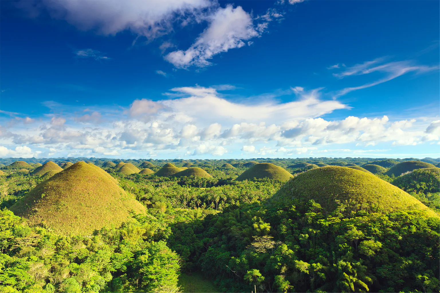 高さ40~120mの丘が大地を埋め尽くす不思議な景観。乾季には丘が茶色に染まりチョコレートのように見える。