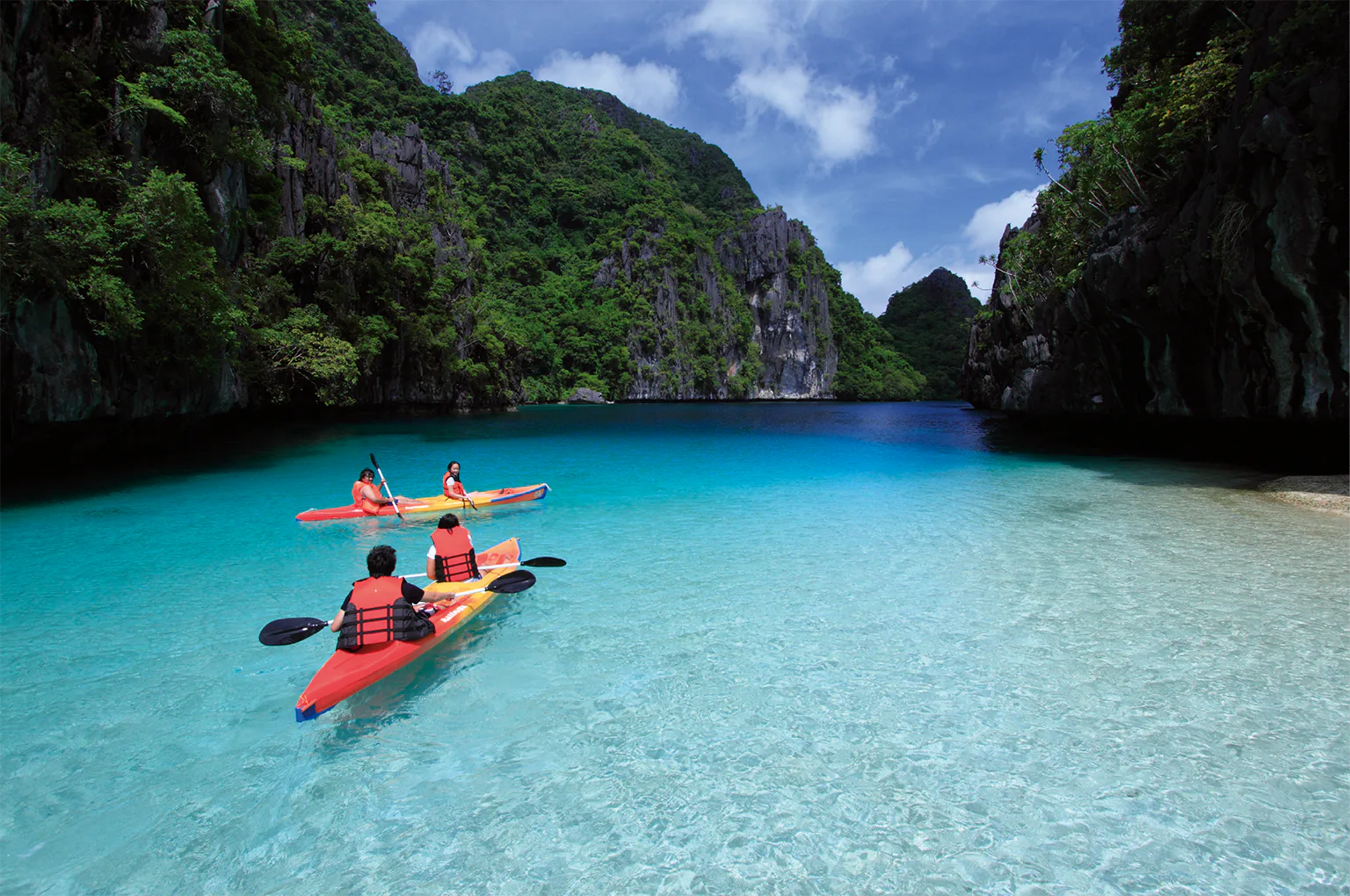 穏やかなラグーンでのシーカヤックは、エルニドリゾーツの人気アクティビティのひとつ。