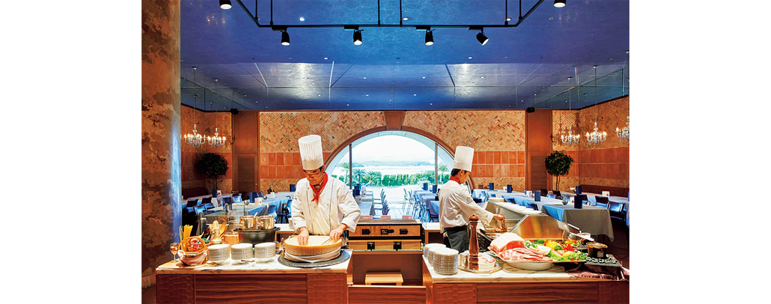 まるで別世界に来たかのように感じられる白浜屈指のラグジュアリーホテル。メインダイニングの贅を尽くした「王様のビュッフェ」も評判だ。