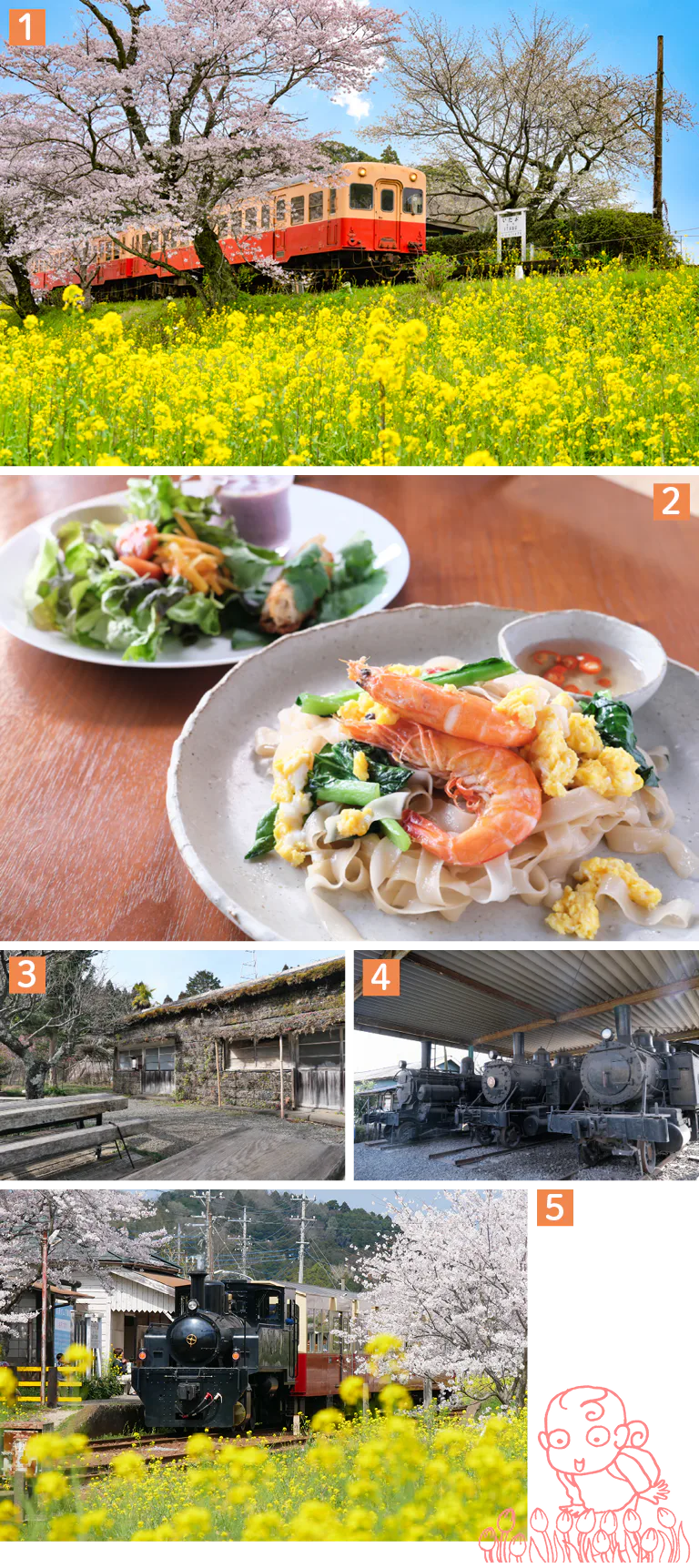 1.飯給駅の菜の花と桜、小湊鉄道。この時期だけの特別な風景 2.古民家を改装した「里山エスニックcafé うさぎや」でランチタイム 3.里山の風景に溶け込む「森ラジオステーション」は一帯がアート作品 4.スタート地点の五井駅には、かつて活躍した蒸気機関車を展示している 5.菜の花畑を走るトロッコ列車