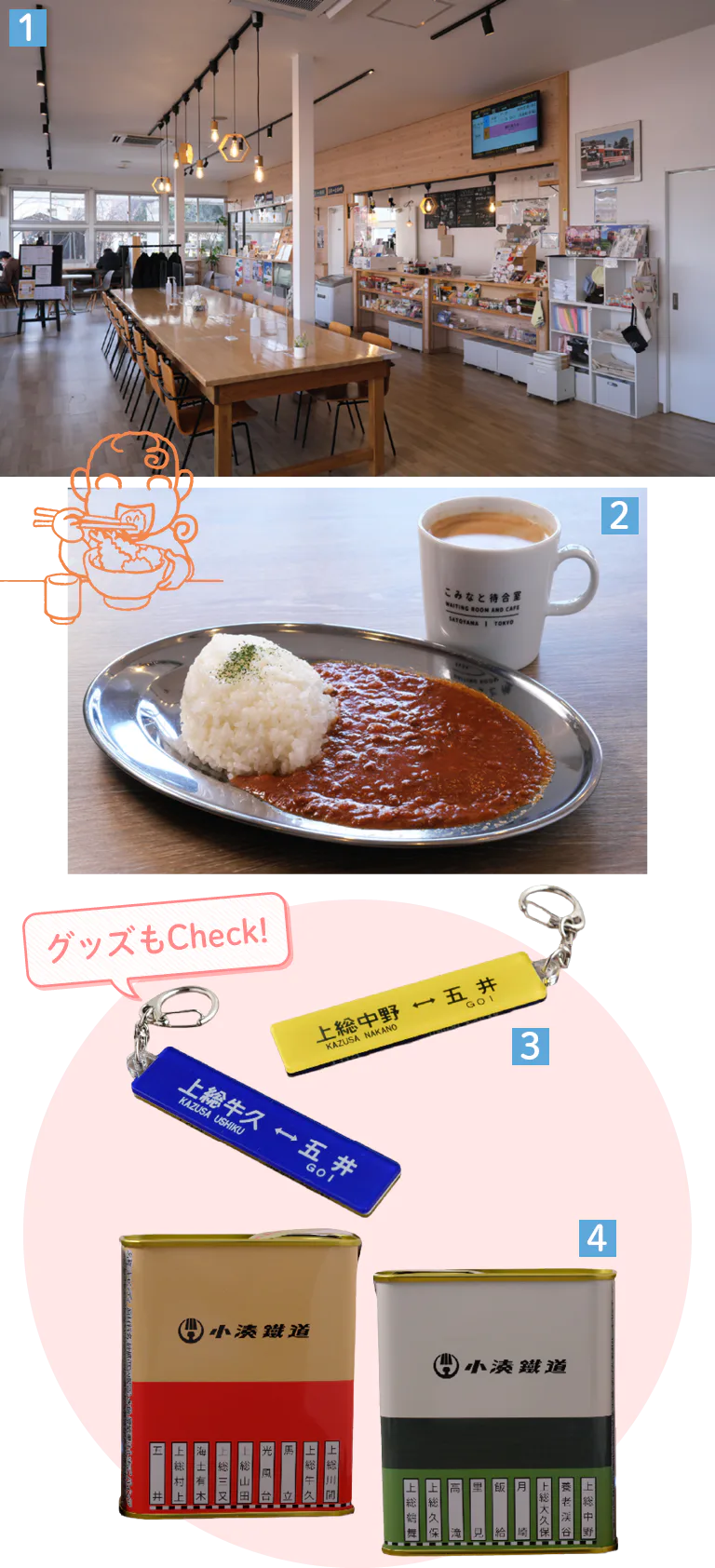 列車やバスの待ち時間に気軽に利用できる待合室。ドリンクや食事を提供するカフェが併設されるほか、小湊鉄道のオリジナルグッズも販売。レトロな列車グッズをおみやげに持ち帰ろう。
