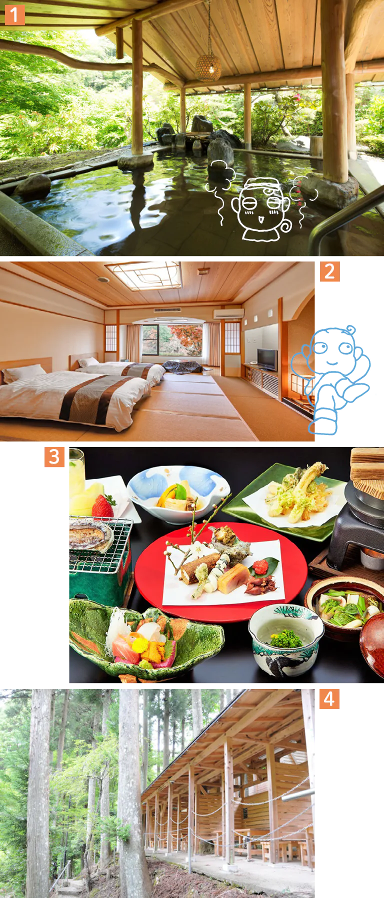 1.自然に包まれた露天風呂「願いの湯」 2.別館にある和洋室 3.自家農園でとれるオーガニック野菜など、旬の素材を使った会席料理 4.「粟又ノ滝」を望む多目的ワーキングエリア滝見テラス。宿泊者は無料で利用できる