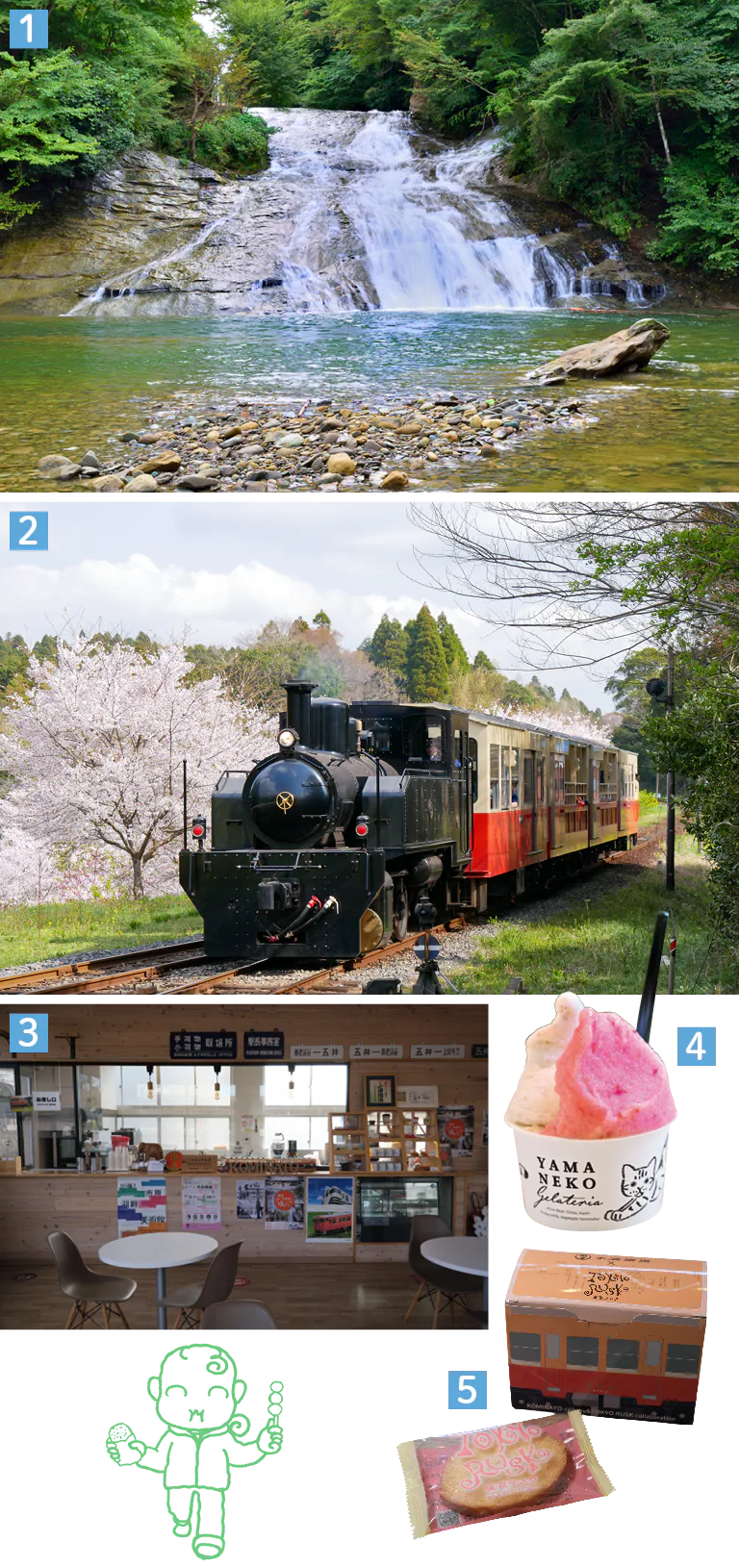 1.房総随一ともいわれる粟又の滝 2.一度は体験したいトロッコ列車 3.鉄道ファンならずとも楽しめる「こみなと待合室」 4.粟又の滝を見下ろす「山里のジェラテリア 山猫」で自然派ジェラートを満喫 5.車両をモチーフにしたおみやげも豊富