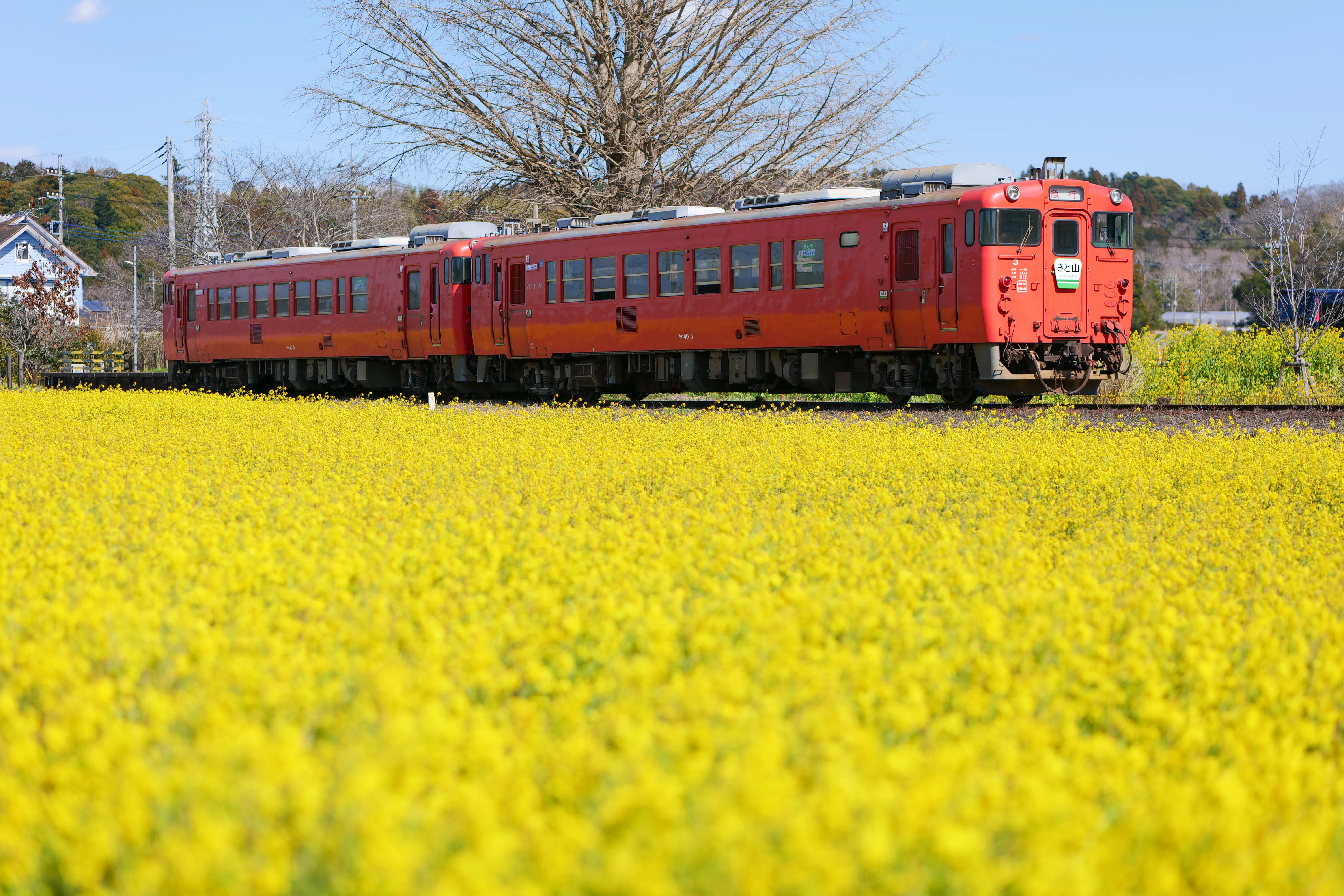 五井駅から小湊鉄道に乗って養老渓谷を目指す。飯給(いたぶ)駅で途中下車して、周辺の菜の花畑を満喫しよう。桜の時期と重なれば、黄色とピンクの見事な風景を撮影できる。駅から歩いてすぐの「里山エスニックcafé うさぎや」では、スパイシーなエスニック料理でランチタイム。名物のベトナムプリンもぜひ試したい。花畑と車両の風景を撮るなら、時刻表で確認して早めの場所取りを。一駅隣の月崎駅には「いちはらアート×ミックス」で制作された作品「森ラジオステーション」や、世界一?大きいトイレがある。次の列車まで時間を持て余すようなら、周辺の里山風景を散歩するのも楽しい。沿線で菜の花が楽しめるのは高滝駅から養老渓谷駅にかけて。車窓の外に広がる黄色い絨毯を愛でながら、のんびりと鉄道旅を満喫しよう。