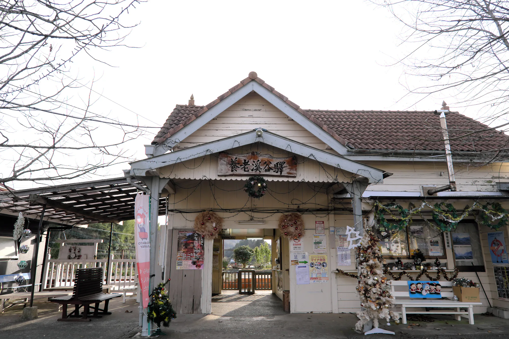 五井駅からは約35km、養老渓谷や養老渓谷温泉への玄関口となる有人駅。朝生原駅として開業し、昭和29年に養老渓谷駅に改称された。養老渓谷のハイライト、粟又の滝方面へのバスが発着する。駅前は以前の森に戻す「逆開発」が進行中だ。