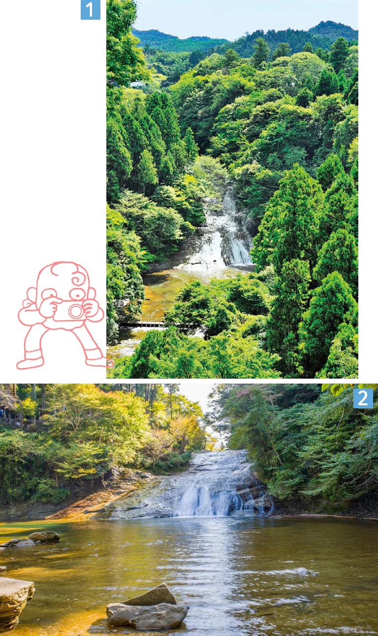 1.道路脇の展望台から見た粟又の滝 2.滝壺に流れ落ちる粟又の滝