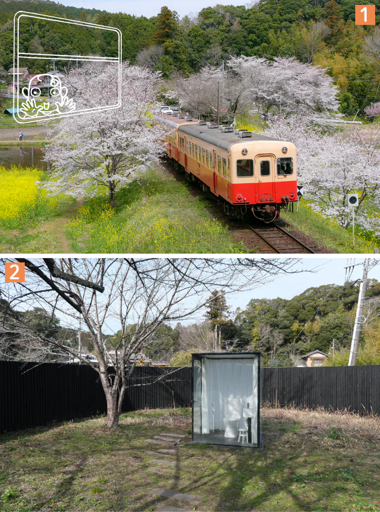 1.3月下旬~4月上旬には菜の花と桜の競演も 2.駅前にある「Toilet in Nature」
