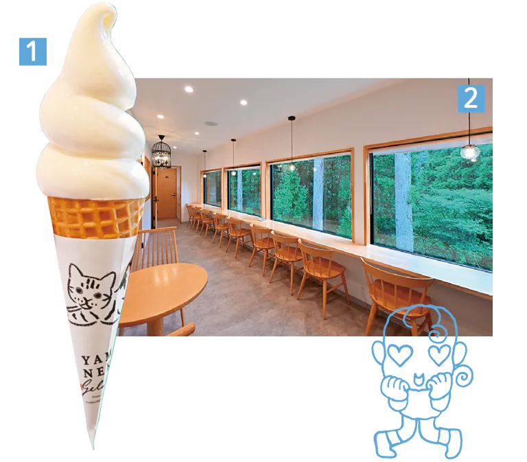 1.千葉県産の牛乳を使ったソフトクリーム500円 2.店内からは養老渓谷を見渡せる