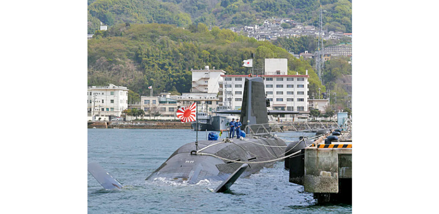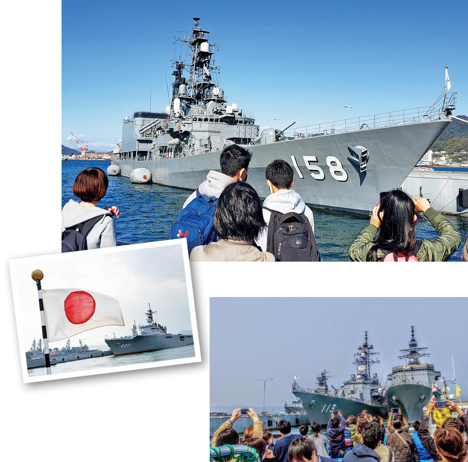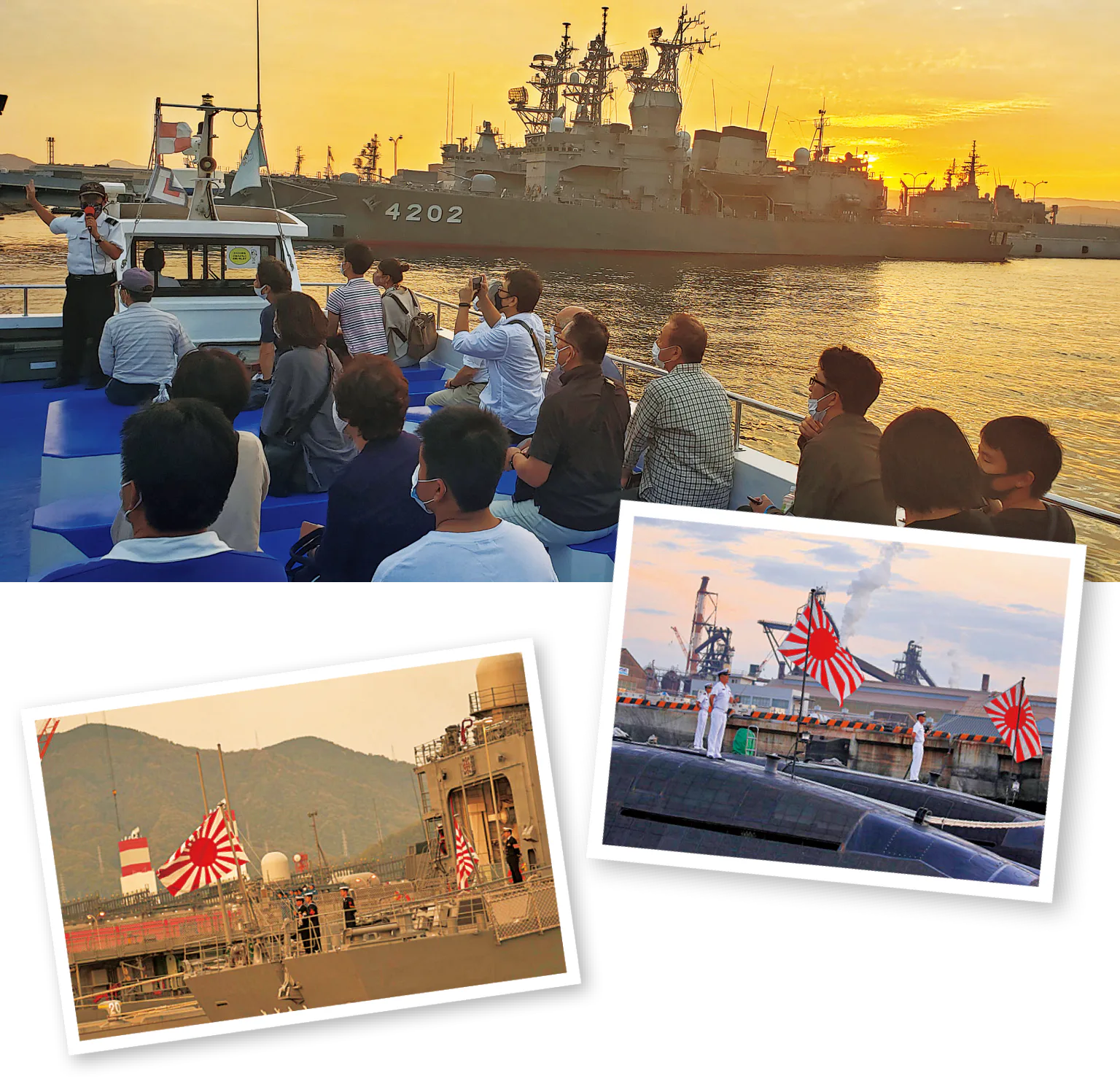 日の入り時刻になるとラッパで『君が代』が奏でられ、すべての艦艇の自衛隊旗が厳かに降ろされる。夕日に染まる呉湾の風景を堪能したら、暮れなずむ基地を背に帰港しよう。まるで鯨のような潜水艦上にも隊員たちが整列(写真右下)。