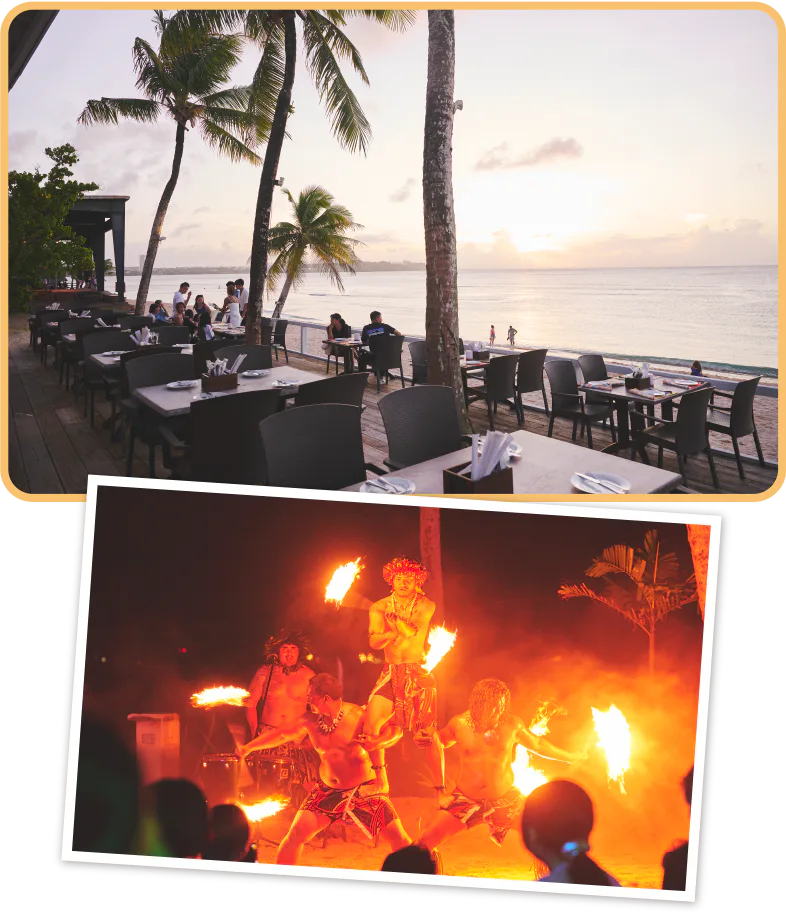 写真上:ガンビーチの真正面に立つ、オープンエアで開放的な「ザ・ビーチ・レストラン・アンド・バー」/写真下:迫力に圧倒される「ホテル・ニッコー・グアム」のディナー・ショーは宿泊者以外でも予約可