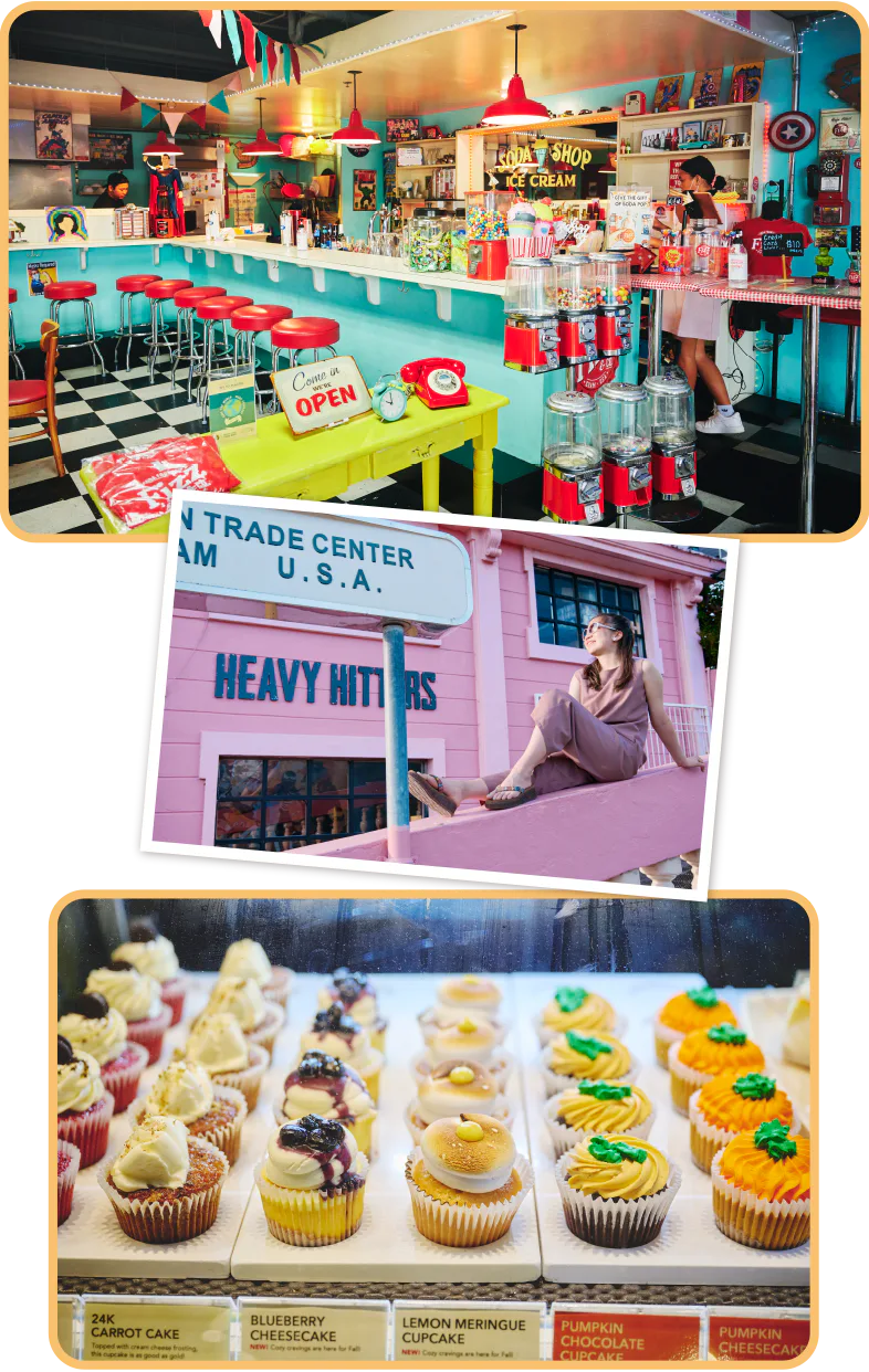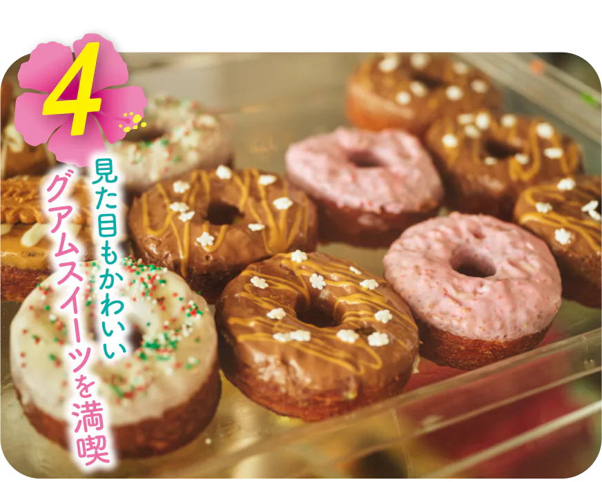 午後は映えスポットをはしごしながら、おやつタイムも楽しもう。フィズ・アンド・コー/Fizz & Co.は、店内のどこを切り取っても絵になる推し店。ストロベリー・クリームソーダやミルクシェイクが人気メニュー。本格フレンチクレープならラブ・クレープ/Love Crepes Guamへ。真っ赤な外観やパリ風のかわいい店内とクレープの組み合わせが映える。ピンクの外壁のタモン・トレード・センター/Tumon Trade Centerは定番のフォトスポット。島内に複数店舗を構えるインフュージョン・コーヒー・アンド・ティー/Infusion Coffee & Teaのカップケーキもおさえたい。