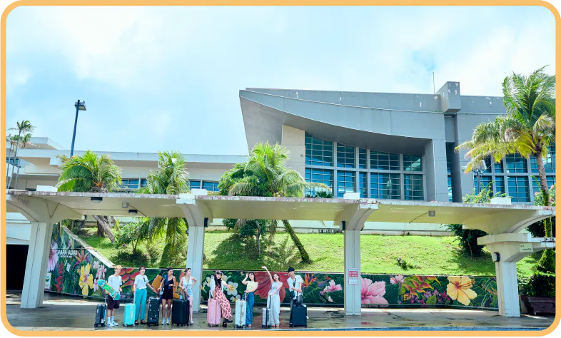 グアム国際空港はタモン地区にあるホテル群からわずか3kmに位置している。日本からは東京(羽田、成田)、名古屋(中部)、大阪(関空)から直行便が発着している。3階建ての複合ターミナルビル内にはレンタカー会社や外貨両替所、大型免税店、グルメスポットが集まっている。24時間営業のフードコートでは日本食も提供。
