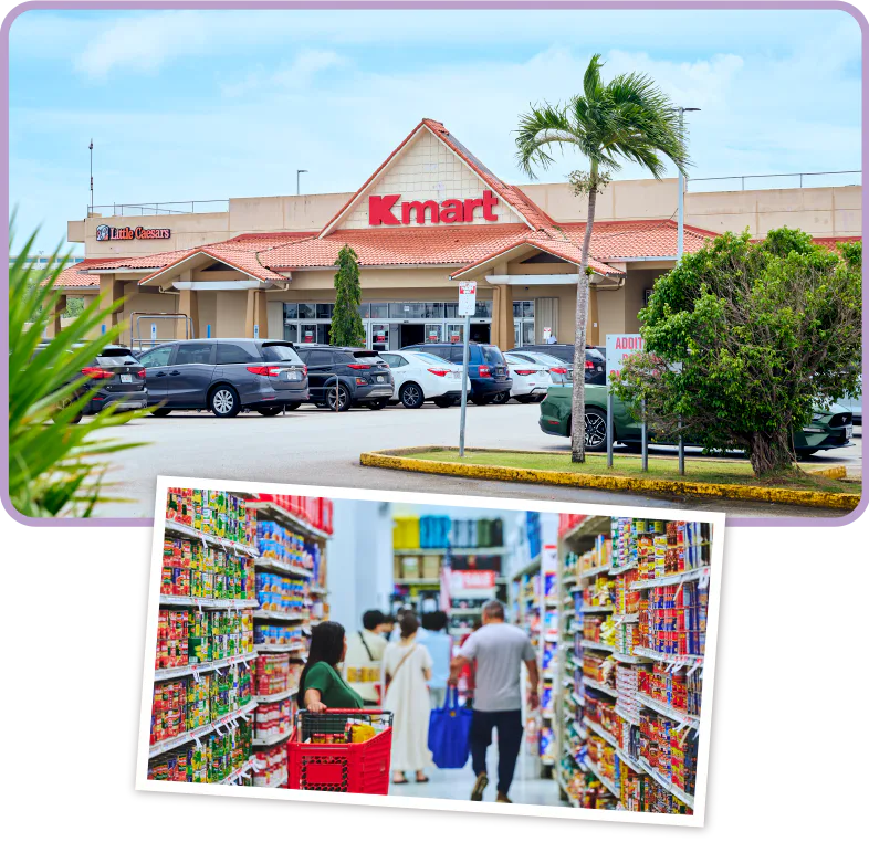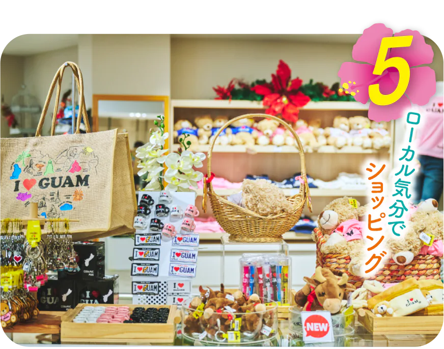 最終日には旅の思い出をゲット。日用品やグルメみやげなどは、24時間オープンのスーパーKマート・グアム/Kmart Guamへ。Tシャツやパーカーなど、GUAMのロゴ入りアイテムもある。ABCストア/ABC Storeは繁華街などあちこちにある便利なコンビニで、雑貨やおみやげなど品揃えも豊富。2024年にオープンしたヴィレッジ・オブ・ドンキ(ドン・ドン・ドンキ)/Village of Donki(Don Don Donki)では、日焼けキャラクターアイテムなどのほか、ここでしか買えないオリジナルみやげがぎっしり。1階のデリコーナーはコスパもよく人気のランチスポットだ。リゾートウェアやハイブランドならショッピングモールへ。デデドにあるマイクロネシア・モール/Micronesia Mallは、100を超えるショップが入るミクロネシア最大級の規模。広々としたフードコートも人気。