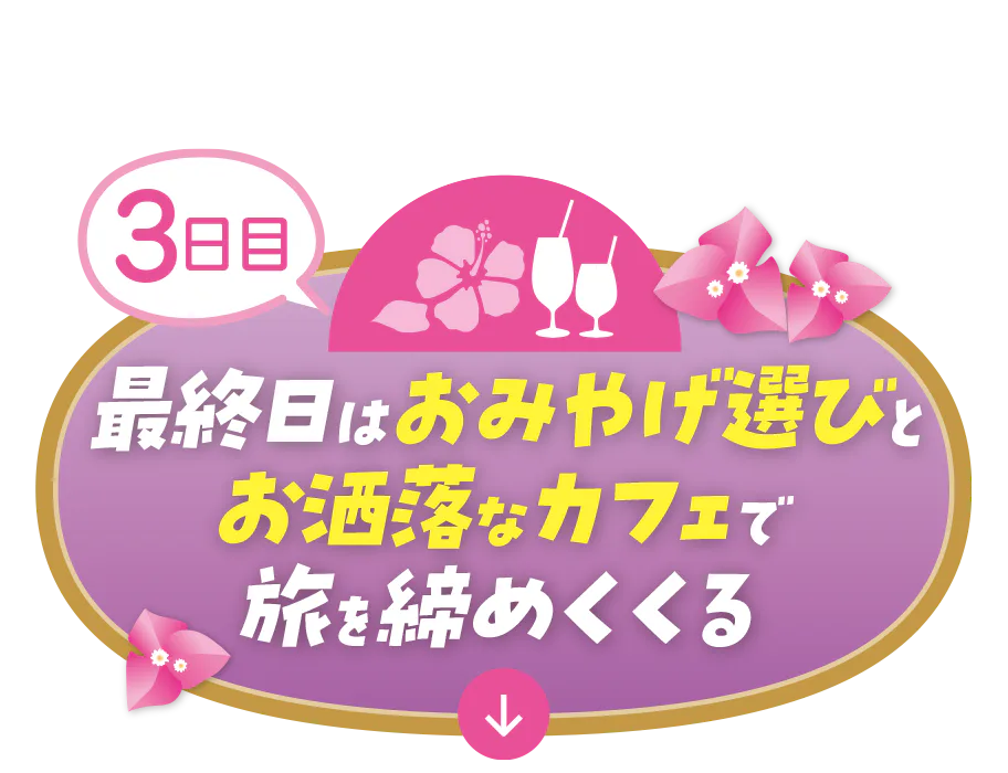 1日目はグアムの大自然に飛び込んで日常から解放されよう。絶対に外せないのがグアムを代表する絶景スポット、恋人岬/Two Lovers Point。また、タモンから車で約1時間ほどの隠れ家的ビーチ、スター・サンド・ビーチ/Star Sand Beachや、透明度の高さと美しいブルーが「映える」と人気のエメラルド・バレー/Emerald Valleyなどにも足を延ばしたい。