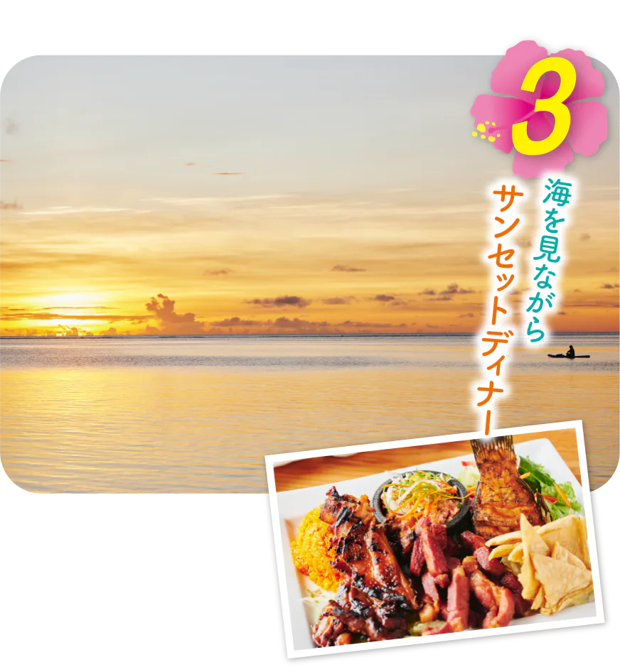 雄大な夕日を眺めながらのロマンティックディナーは格別。グアム伝統のチャモロ料理(写真下)を豪快に頬張りたい